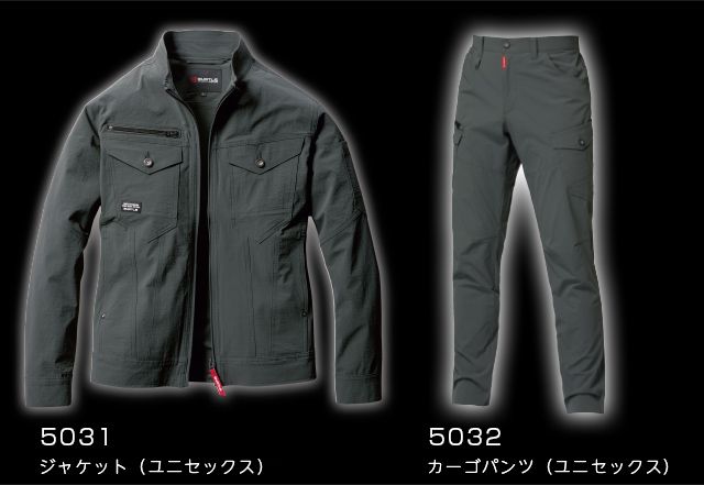 - 軽量、撥水性、アルミC加工による遮熱性(–8°C)を備えたソフトシェル素材